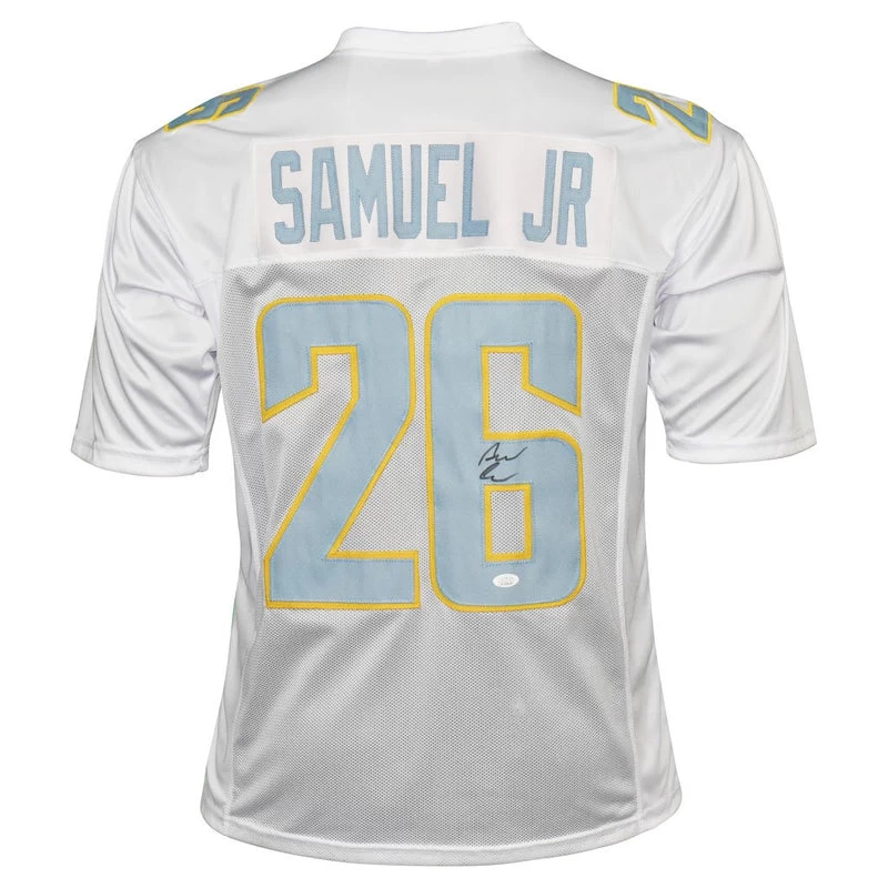 You are purchasing an Asante Samuel Jr signed Los Angeles Chargers White NFL football jersey.