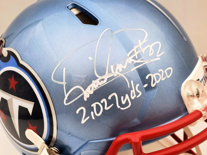You are purchasing a Derrick Henry hand signed official Tennessee Titans flash blue full sized NFL helmet with an inscription that reads “2027 Yds-2020”.