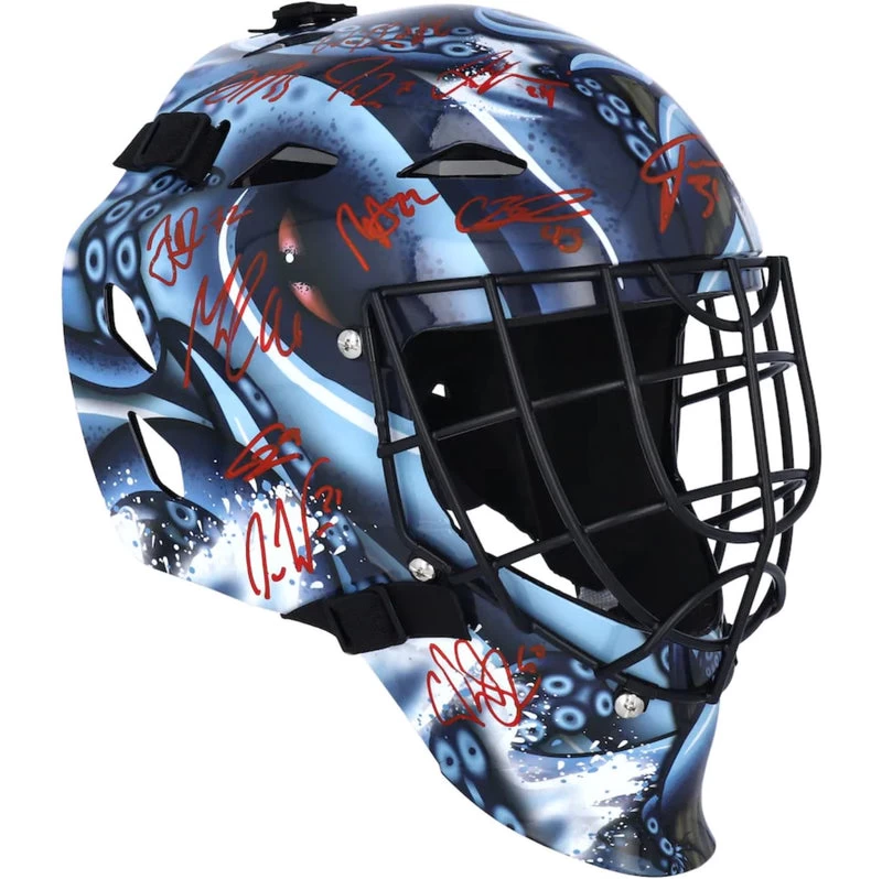 Celebrate the inaugural season of the Seattle Kraken with this autographed Replica Full-Size Goalie Mask. Hand-signed by a bunch of your favorite Seattle Kraken stars, this limited edition mask will make for the ultimate collectible to remember the start of the franchise. Display this in your home or office for a true piece of Seattle Kraken history.
