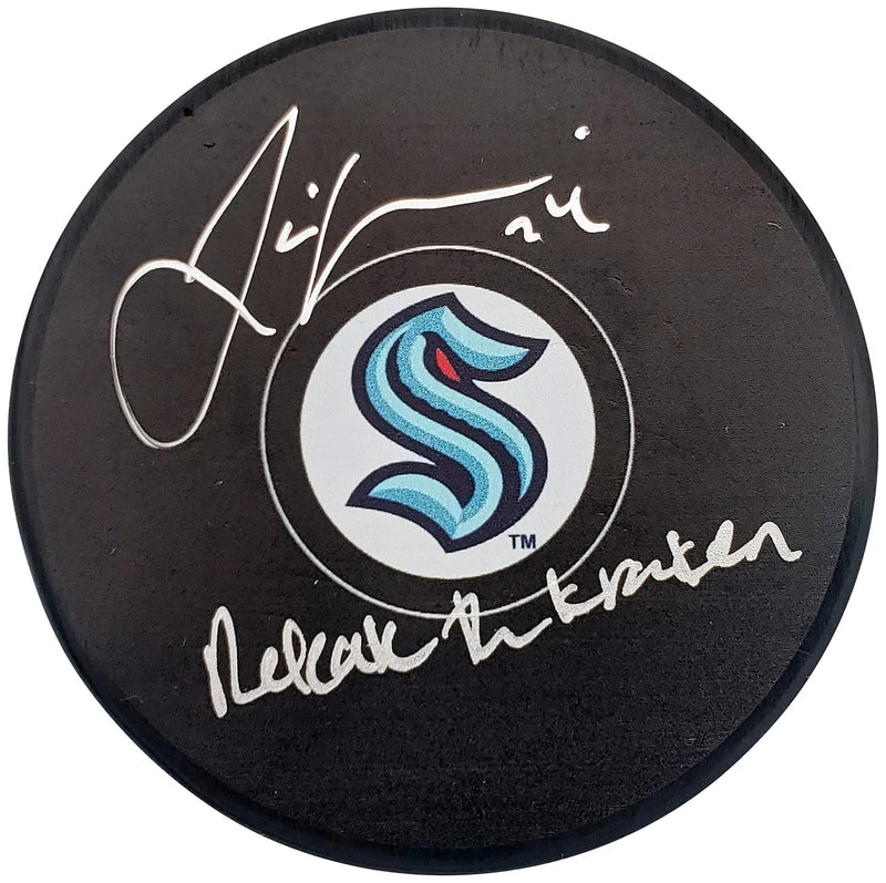 You are purchasing a Jamie Oleksiak hand signed official Seattle Kraken hockey puck with a “Release the Kraken” inscription.
