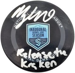 You are purchasing a Morgan Geekie hand signed official inaugural season Seattle Kraken hockey puck with a “Release the Kraken” inscription.