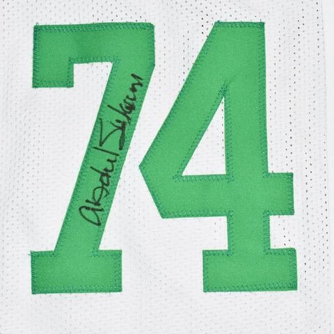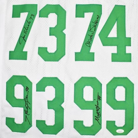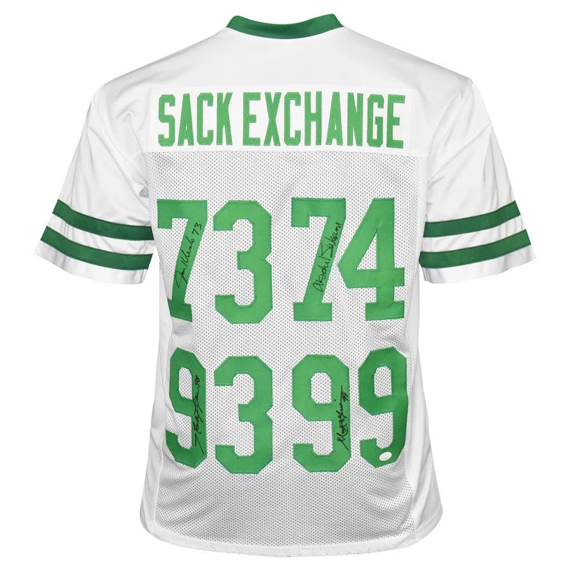 You are purchasing a Sack Exchange 4-Signature hand signed New York Jets White replica NFL football jersey.